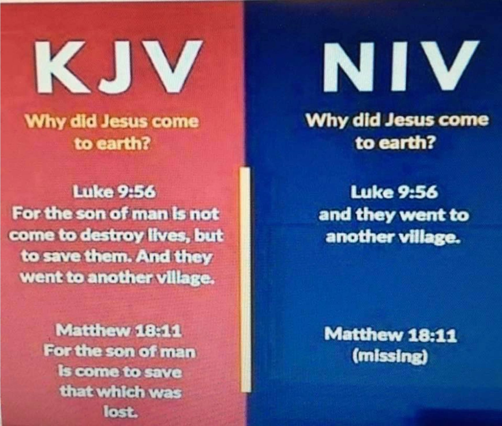 Which brings me to the image I posted above. Why does the NIV omit some of the wording of Luke 9:56 and totally exclude Matthew 18:11 (by the way, these are just two of many similar examples)? (Sidenote: The NIV is actually one of many modern translations that omit these sections).